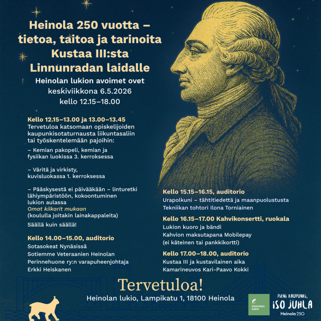 22.4.2026 Heinola 250 vuotta -tapahtuma lukiolla ke 6.5. klo 12.15-18 Jaa Kopioitu leikepöydälle Takaisin ajankohtaisiin