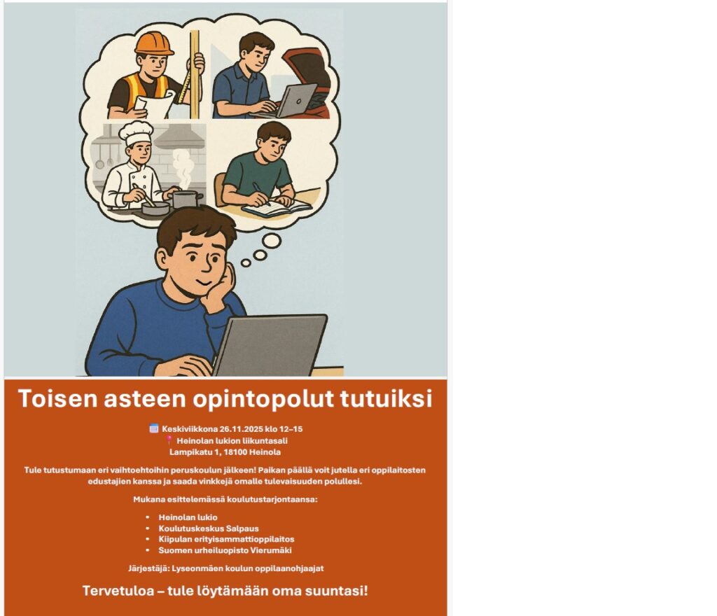 29.10.2025 Toisen asteen opintopolut tutuiksi -tapahtuma 26.11.2025 Jaa Kopioitu leikepöydälle Takaisin ajankohtaisiin